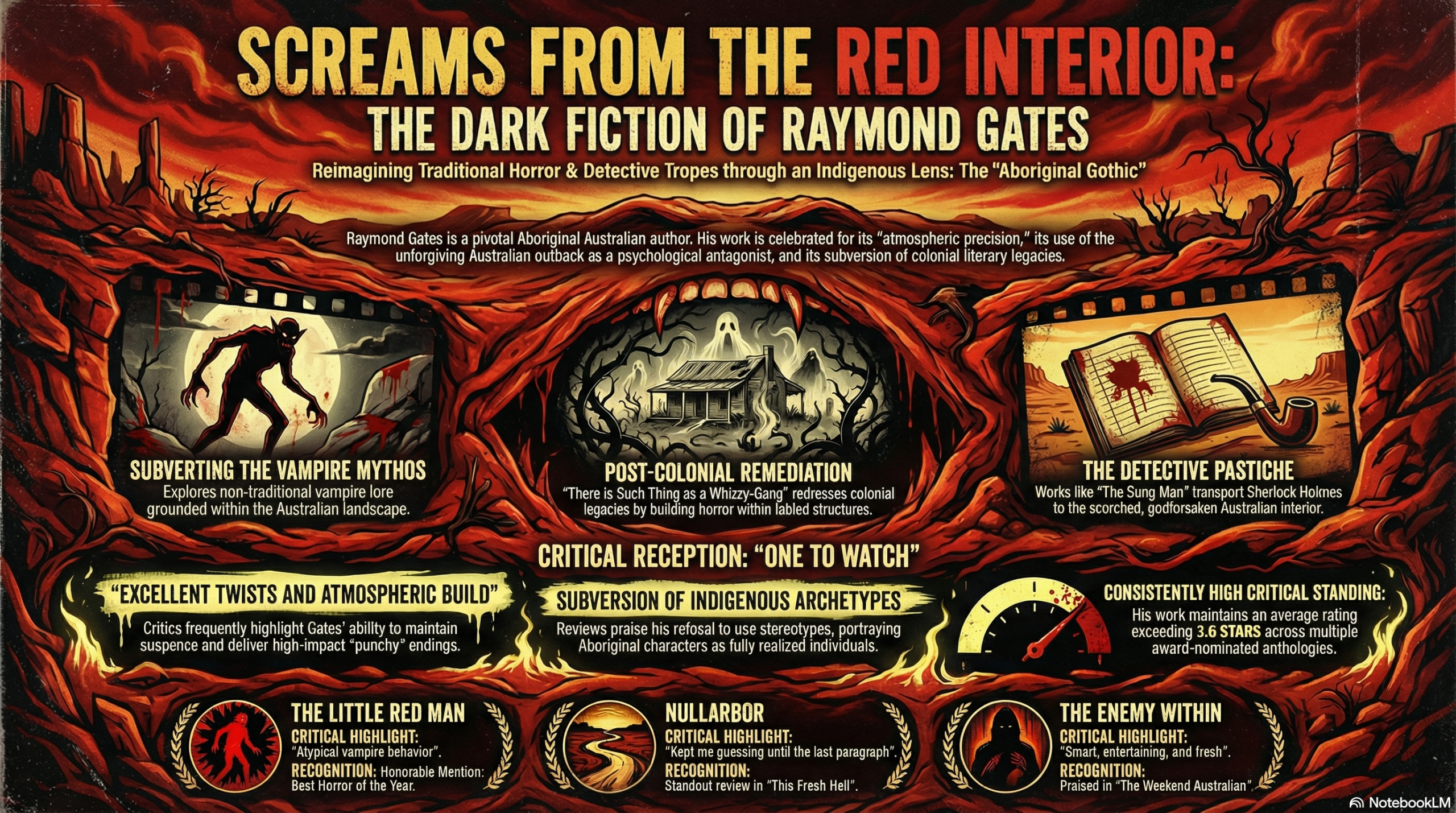 The reviews of Raymond Gates’ short fiction reveal a writer whose work is deeply rooted in the tensions of the Australian continent—geographical, historical, and cultural. The critical consensus identifies him as a master of building suspense and a thoughtful subverter of genre expectations. From the “Honorable Mention” status of his early vampire tales to the “thinking outside the box” accolades for his detective pastiches, Gates has established a professional reputation for qualitative excellence and narrative innovation.[1, 2, 6] His ability to weave Aboriginal themes into the “Dark Fantastic” without falling into caricature has made his work essential reading for those tracking the progress of Indigenous speculative voices. The bibliography of review sites and publications serves as a map of his impact on the genre, documenting a career that continues to challenge, entertain, and enlighten readers within the global horror community.